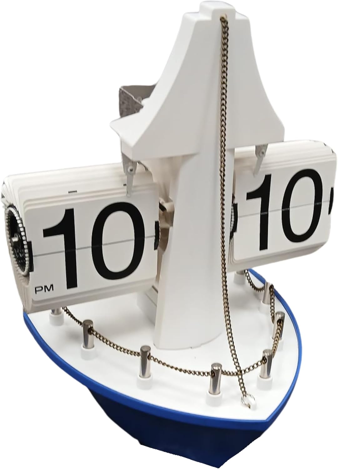 - Nautical themed ship deck flip clock designed with a curved boat style base tall central mast and detailed chain railings creating a standout maritime display piece that enhances desks bedside tables bookshelves or office areas with unique decorative character.
