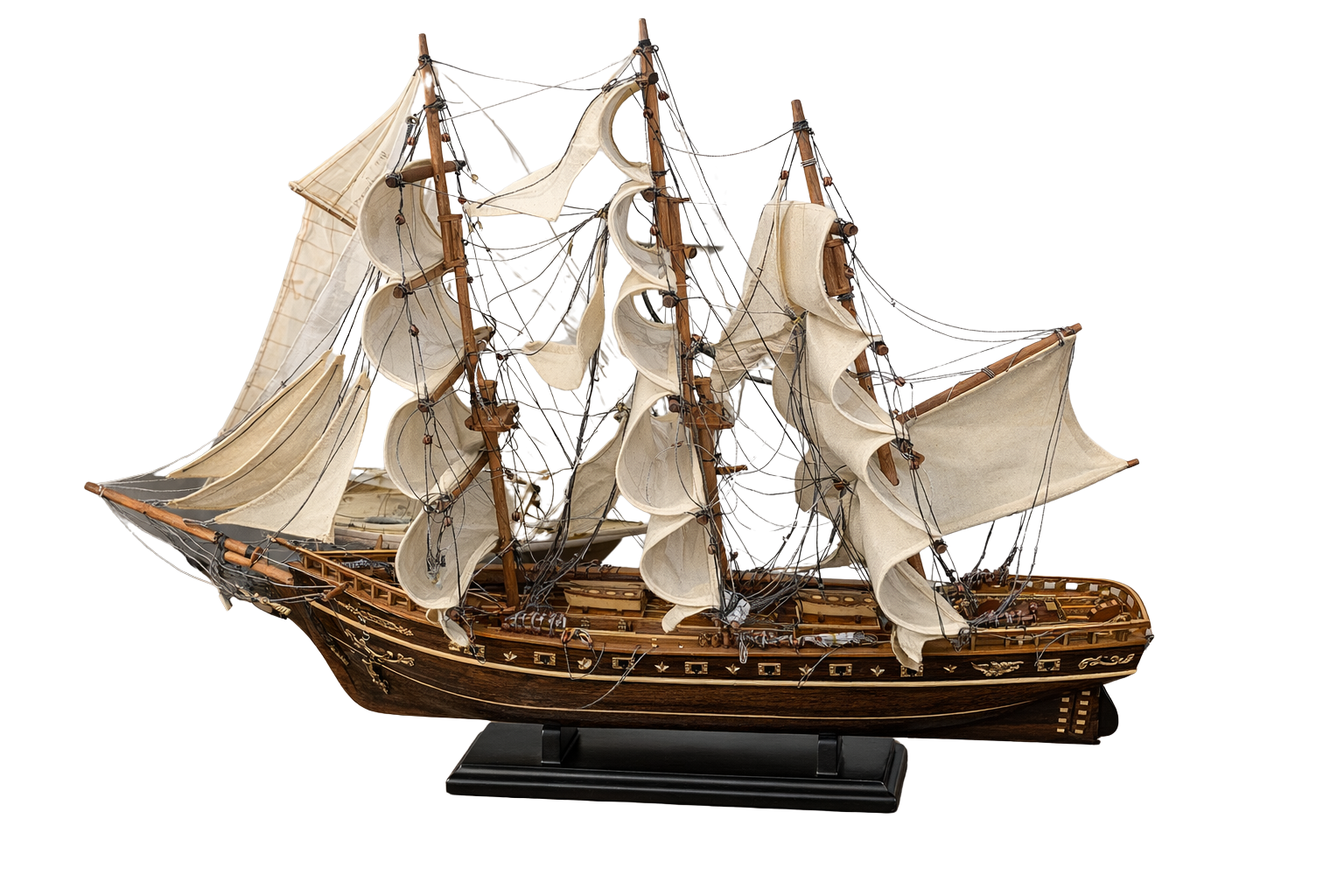 Expertly crafted with a richly finished wooden hull, the ship features multiple tall masts fitted with layered cream canvas sails that are carefully shaped to give the impression of movement at sea. Detailed rigging runs throughout the model, showcasing the complexity and elegance of traditional sailing vessels. Fine deck details and decorative hull accents add depth and authenticity, making the model visually engaging from every angle.